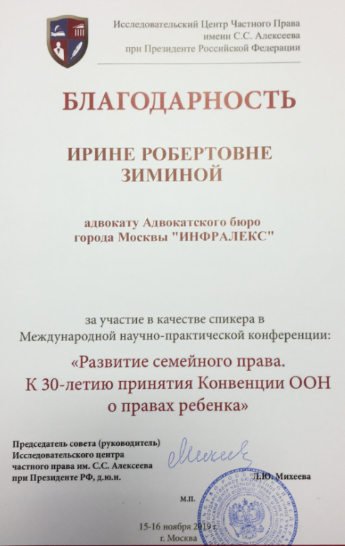 АДВОКАТ ИНФРАЛЕКС ИРИНА ЗИМИНА ПОЛУЧИЛА БЛАГОДАРНОСТЬ ИССЛЕДОВАТЕЛЬСКОГО ЦЕНТРА ЧАСТНОГО ПРАВА ИМЕНИ С.С. АЛЕКСЕЕВА ПРИ ПРЕЗИДЕНТЕ РФ